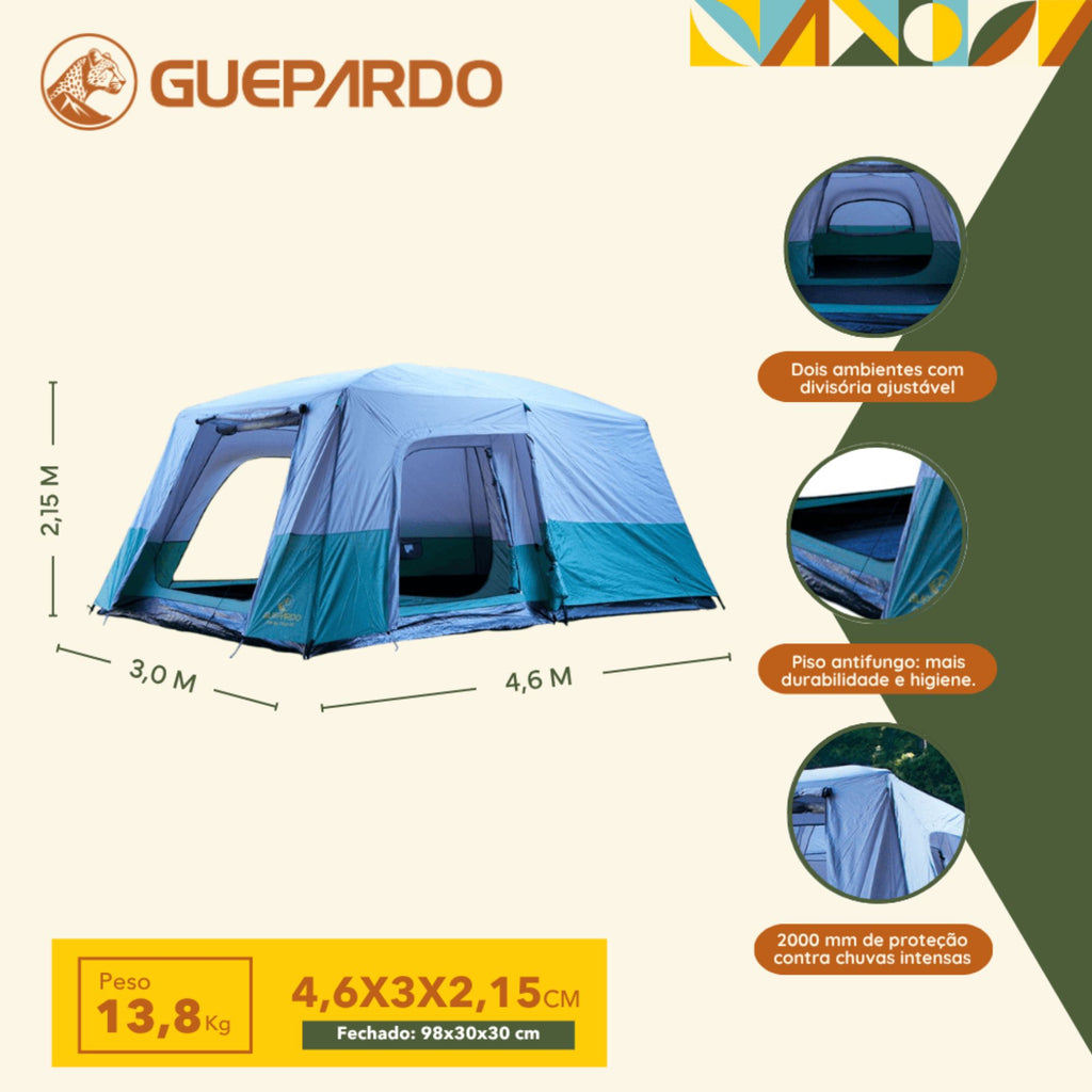 Aproveite os momentos ao ar livre com a praticidade e conforto da Barraca de Camping Guepardo, uma escolha confiável para suas aventuras.