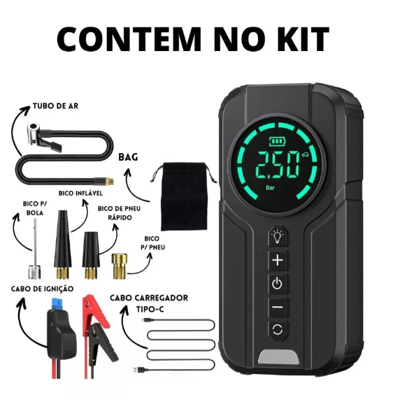 • 1 Bomba de Ar Inteligente Portátil com Cabo de Ignição de Emergência