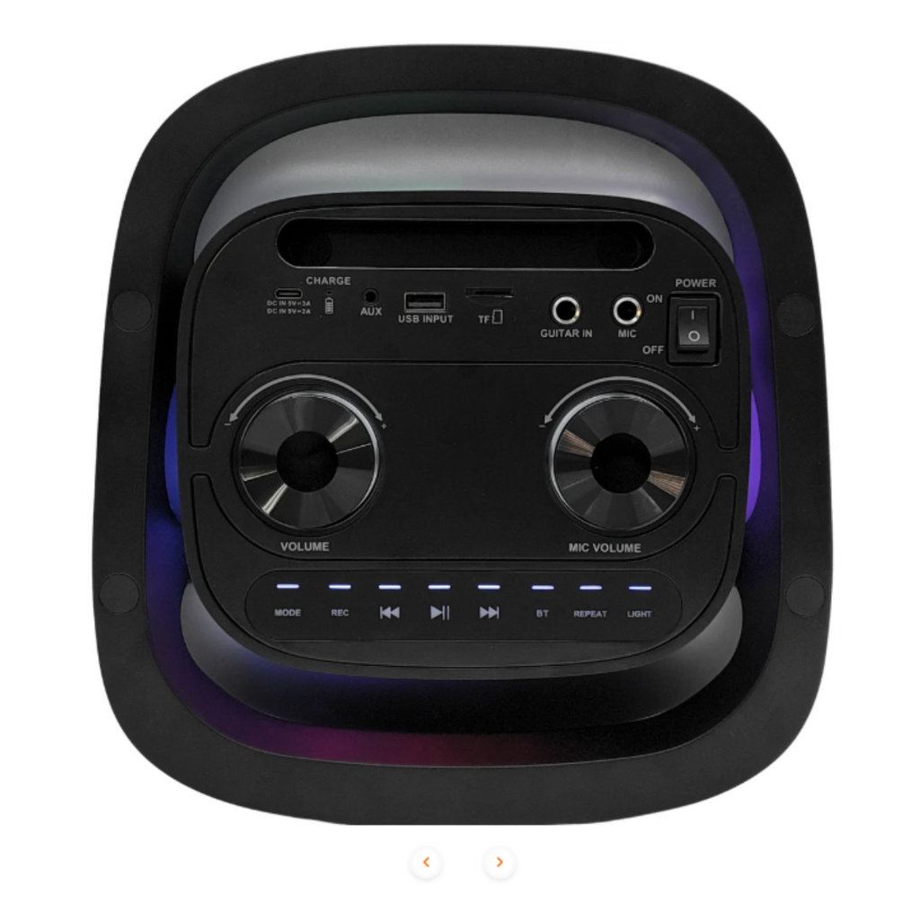 A conectividade Bluetooth 5.3 oferece emparelhamento rápido com alcance de até 15 metros. A bateria de 4000mAh garante longa autonomia, enquanto a função TWS permite conectar duas caixas para som estéreo. Conta ainda com iluminação LED dinâmica, rádio FM, função de gravação e entradas versáteis como USB, cartão TF, AUX, microfone com fio e guitarra.