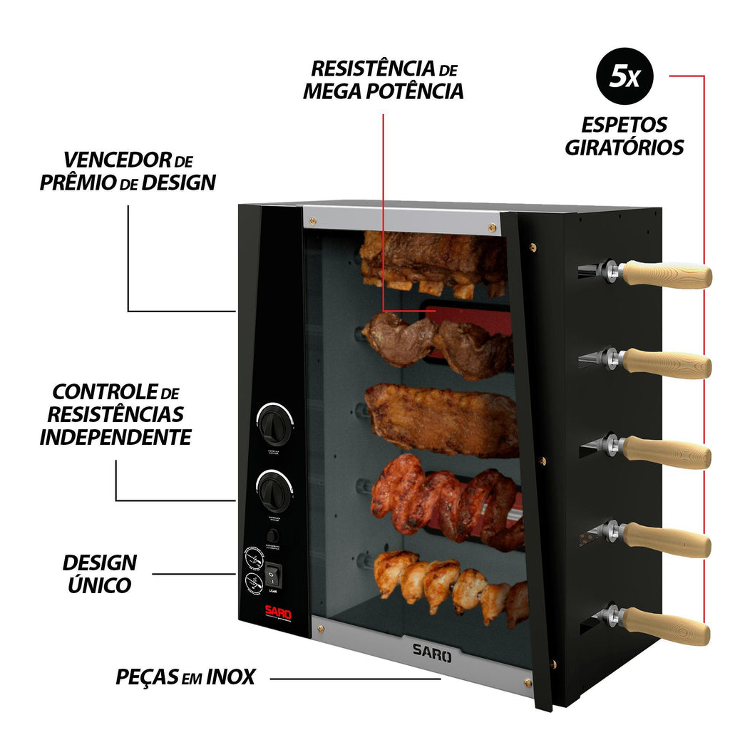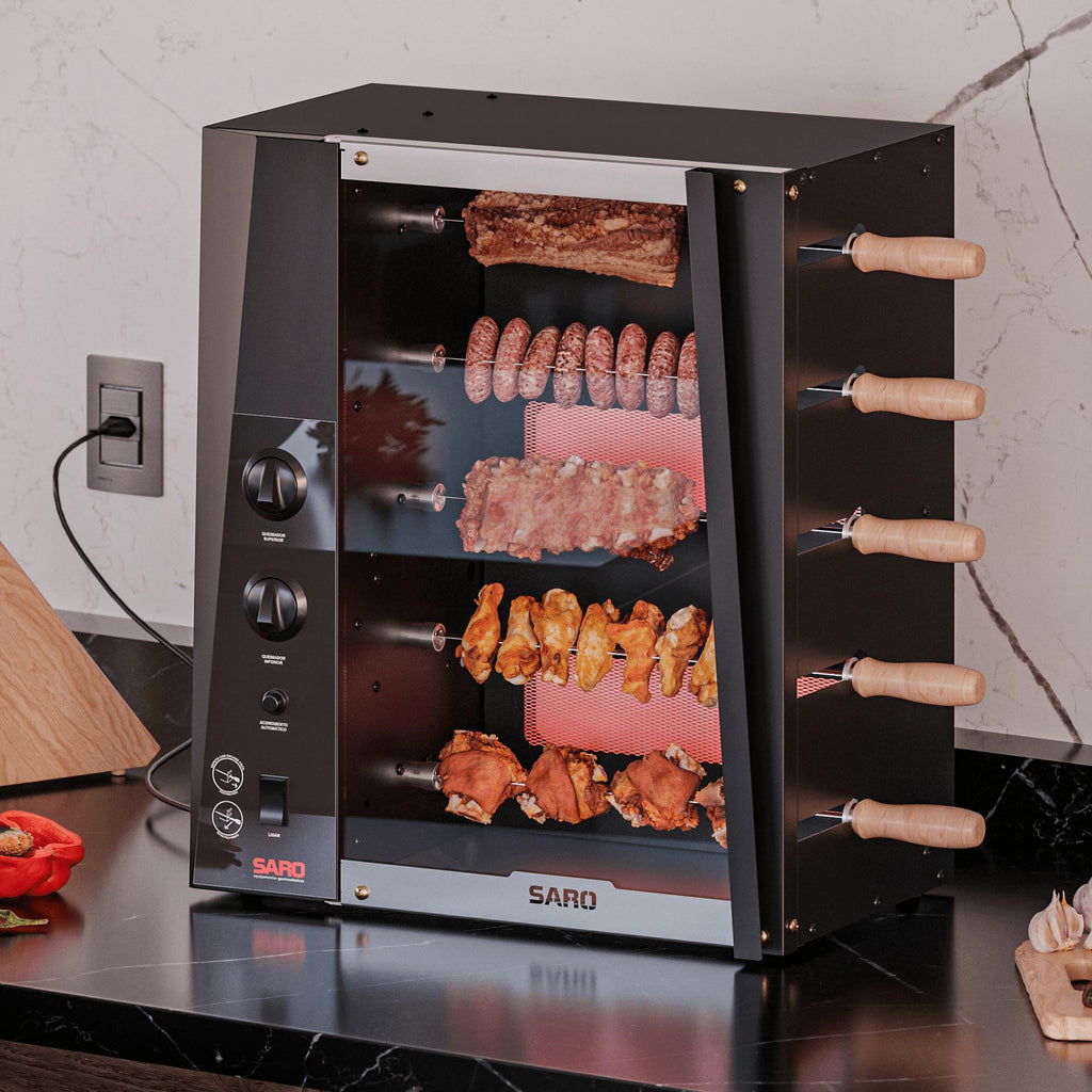 A churrasqueira rotativa a gás GLP com 5 espetos é a solução perfeita para quem quer praticidade e sabor no churrasco. Basta apertar um botão para acender, sem fumaça e sem sujeira, garantindo uma experiência muito mais rápida e limpa que o carvão. O sistema rotativo e a bacia de água mantêm a carne suculenta e macia, com sabor incrível, ideal para apartamentos ou locais com pouca ventilação. • Fabricada em aço inox 304 de alto brilho • Possui acendedor automático • Bandeja coletora de gordura • Revestimento térmico para melhor eficiência • Queimador infravermelho de alto calor • Fio anti-chamas certificado pelo Inmetro • Funciona com gás GLP • Sistema rotativo com 5 espetos Produto com garantia de 1 ano contra defeitos de fabricação e suporte técnico online para tirar dúvidas. Adquira agora sua churrasqueira e transforme o jeito de fazer churrasco em casa!