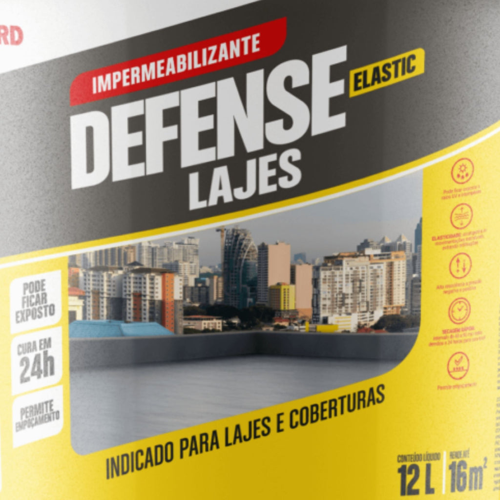 Impermeabilizante Defense Elastic Lajes – 12 L O Defense Elastic Lajes é a solução ideal para impermeabilizar lajes, coberturas e terraços com eficiência e praticidade. Sua fórmula à base de polímeros acrílicos cria uma camada elástica e resistente que suporta empoçamento, variações térmicas e exposição direta ao sol, garantindo máxima proteção contra infiltrações. Permite acabamento cerâmico e é indicado para áreas expostas ou enterradas, sem necessidade de proteção mecânica adicional. • Base: polímeros acrílicos • Viscosidade: 4.500 – 5.500 cps • Densidade: 0,95 – 1,05 g/cm³ • Teor de sólidos: 39 – 41% • pH: 8 – 10 • Tempo entre demãos: 40 a 90 minutos • Cura total: 24 h • Validade: 18 meses • Aplicação: lajes, terraços, piscinas, áreas expostas ou enterradas • Compatível com concreto, alvenaria, madeira, PVC e metais (exceto alumínio) Garanta mais durabilidade e segurança para sua obra com o Defense Elastic Lajes e evite retrabalhos causados por infiltrações!