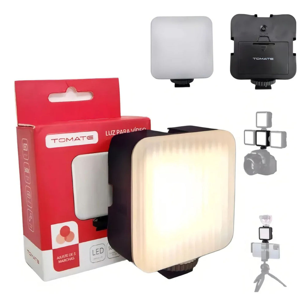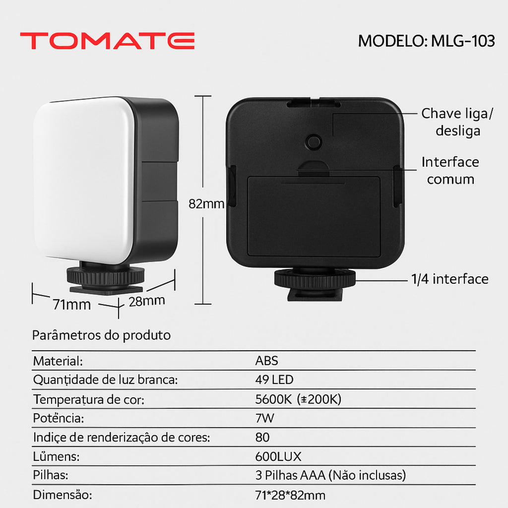 Luz de Preenchimento de LED para Vídeo MLG-103 – 49 LEDs, Portátil e Potente Melhore a qualidade das suas gravações e fotos com a luz de preenchimento MLG-103 da Tomate. Compacta e prática, conta com 49 LEDs que oferecem iluminação branca neutra (5600K), ideal para vídeos, lives, fotos de produtos e muito mais. Compatível com tripés e câmeras, possui suporte tipo sapata (cold shoe) e pode ser utilizada em qualquer lugar graças à alimentação por 3 pilhas AAA (não inclusas). Fabricada em plástico ABS leve e resistente, entrega aproximadamente 600 LUX de intensidade, sendo uma excelente opção para quem busca praticidade e qualidade de imagem.
