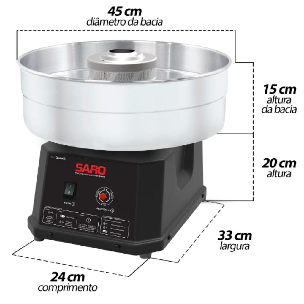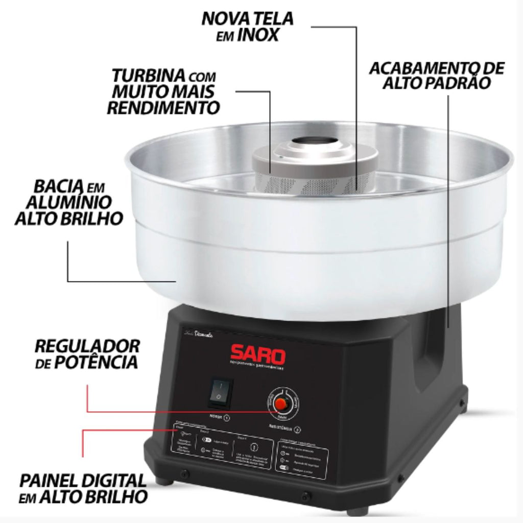 A Máquina de Algodão Doce Elétrica Saro é sinônimo de potência, praticidade e desempenho profissional. Desenvolvida para oferecer alta produtividade, é capaz de preparar até 4 algodões doces por minuto — ideal para buffets, festas, eventos, locações e promoções. Seu design robusto e tecnologia avançada garantem maior durabilidade, menos manutenção e resultados impecáveis, com fios de açúcar uniformes e textura perfeita.